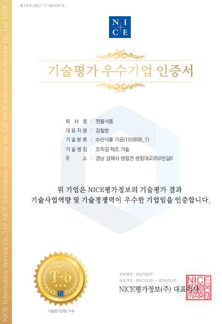 기술평가 우수기업 인증서